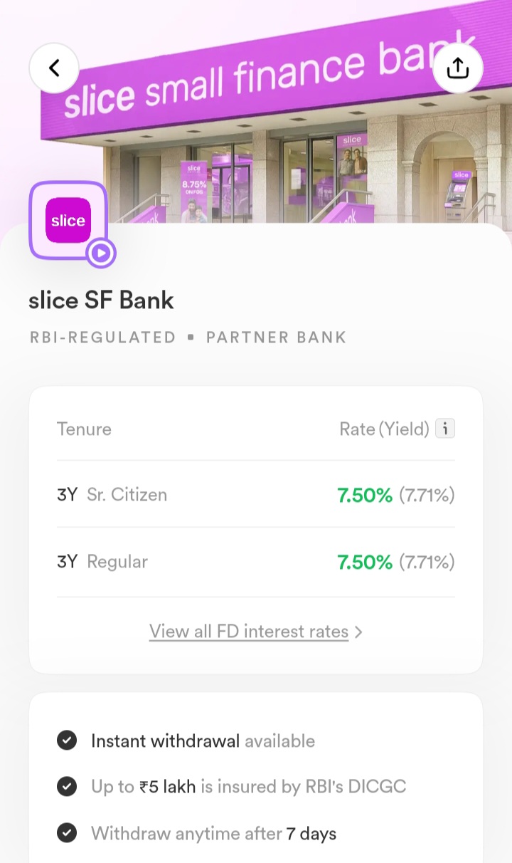 Slice Small Finance Bank (বা আগে North East SFB নামে পরিচিত) কিছু বিশেষ মেয়াদ (যেমন 3 বছর) FD–তে 7.50% পর্যন্ত সুদ পাওয়া যায়। যদি আপনি “মাঝারি-term + ভালো রিটার্ন” খুঁজছেন, তাহলে এটি বিবেচনাযোগ্য।