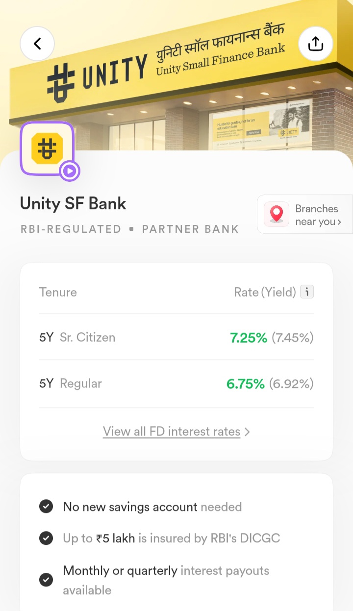 Unity Small Finance Bank কিছু নির্দিষ্ট মেয়াদে FD–তে 8% পর্যন্ত রিটার্ন দেওয়ার তথ্য রয়েছে। একটু খেয়াল করে (মেয়াদ, শর্ত) নিলে তুলনামূলক ভালো রিটার্ন পাওয়া সম্ভব।